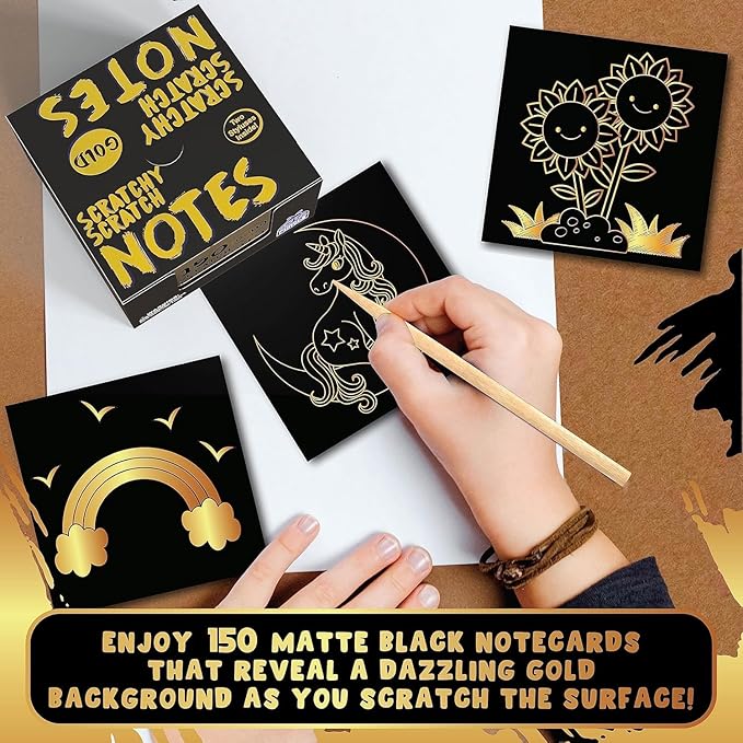- Magic Doodle Paper - Black scratch art note cards with fun metallic gold layer hidden under the black matte coating; each order comes with one box of 150 sheets of notecard scratch paper and 2 stylus pens for messages.