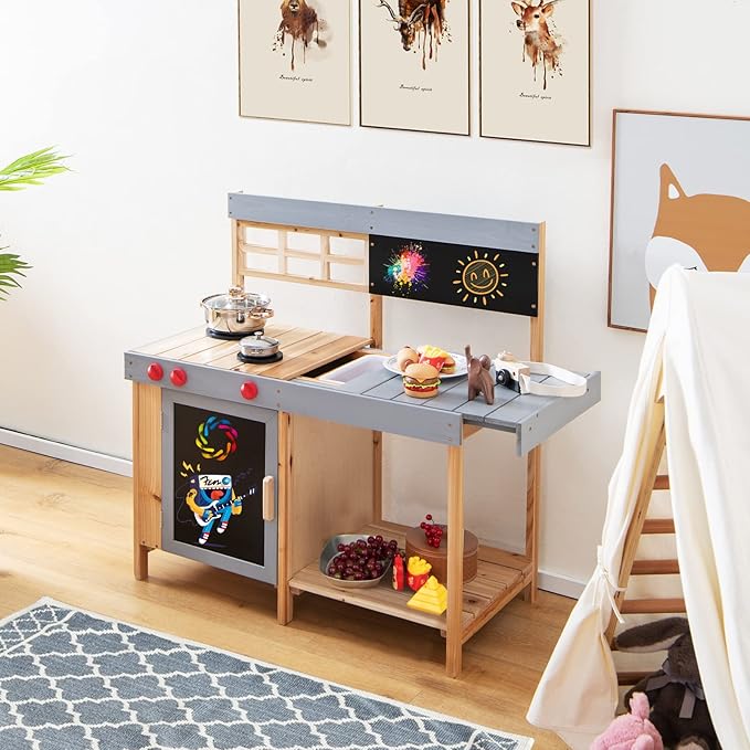 - 【Countless Ways to Play】This mud kitchen fulfills kids' dreams of becoming chefs as they can make pretend food with mud. This outdoor play kitchen combines a variety of fun in one, so kids can enjoy writing on the blackboard, mixing mud, turning the ignition knob, cooking a meal, etc. It is worth mentioning that the knob mimics a real ignition scene and produces a "click" sound.