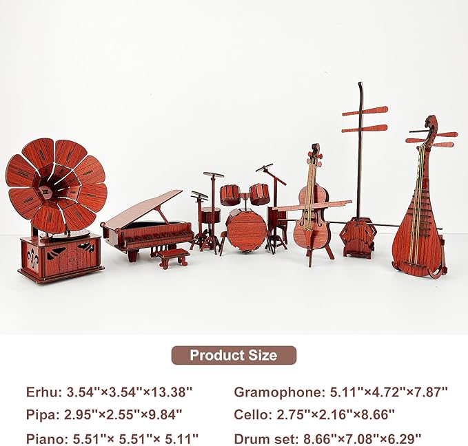 - 【Engaging Music Instrument Set】 Experience the joy of assembling these elaborate wooden 3D puzzles. This set includes six musical instruments: a piano, gramophone, drum kit, cello, erhu, and pipa. Each puzzle piece is crafted with high-quality wood and exquisite craftsmanship, not easily breakable, ensuring durability and a satisfying puzzle experience. Add joy and challenge to your life