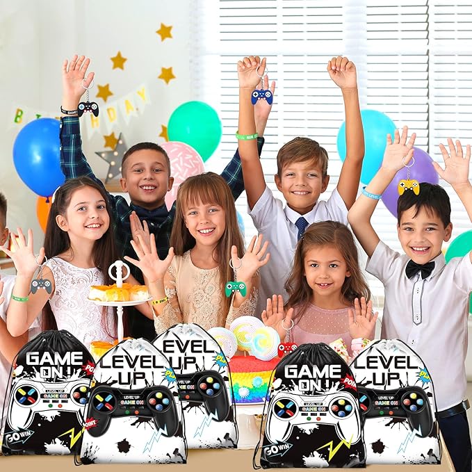 Nosiny 72PCS Video Game Party Favors Birthday Include 24 Video Game Goodie Drawstring Bags 24 Silicone Bracelet 24 Controller Keychain for Kids for Party Supplies (Black, White, Cute)