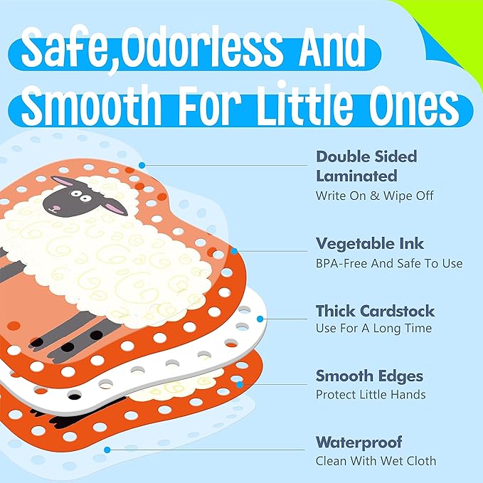 - Premium Material: The lacing cards are made of sturdy cardstock, durable and handy. Double side printed with premium plant ink, non-toxic and no odd smell, safe enough for toddlers’ use. The laces are made of quality polyester, which is not simple to break, and can serve you for a long time.