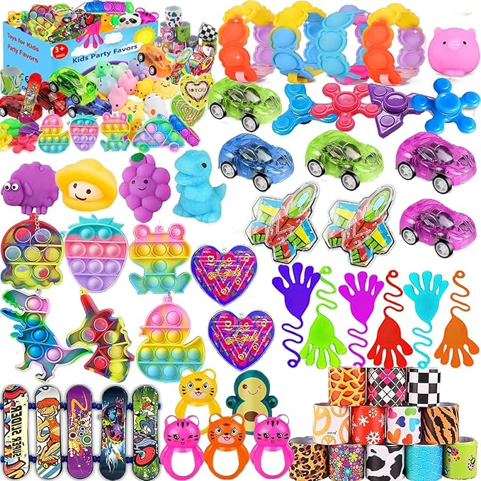 - Assortment premium party favors toys set: 4 pop bracelets, 4 cute pop fidget toys, 6 ainmal pull back cars, 6 fidget spinners, 6 mochi squishy toys, 6 tumbler toys, 6 skateboard toys, 6 sticky hands, 6 pull back cars, 8 fluffy toys, 10 slap bracelets, 50 stickers. Total 118 pcs party favors for kids.