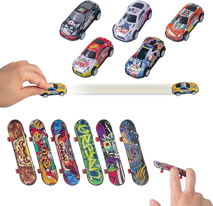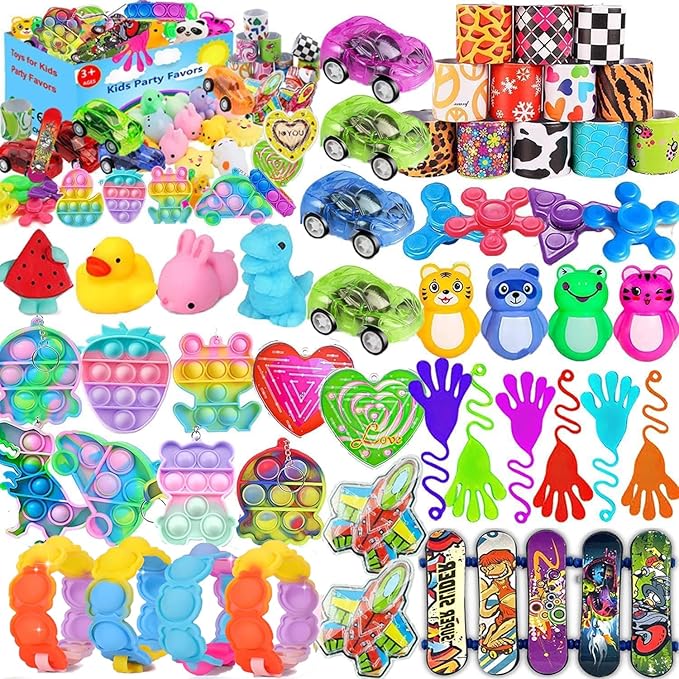 - Assortment premium party favors toys set: 4 pop bracelets, 4 cute pop fidget toys, 6 ainmal pull back cars, 6 fidget spinners, 7 mochi squishy toys, 7 sticky hands, 6 mini skateboards, 6 pull back cars, 6 tumbler toys, 8 fluffy toys, 10 slap bracelets, 50 stickers. Total 120 pcs prizes toys bundle.
