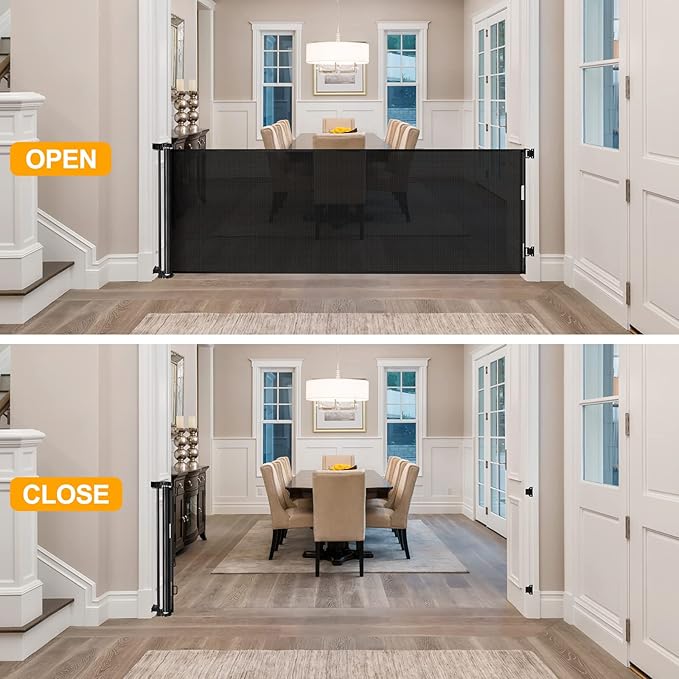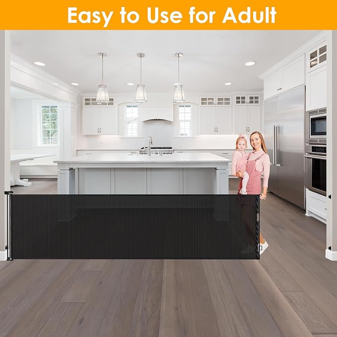 - Easy to Use for Adult : adults can open the retractable pet gate with one hand, while children cannot. The extra wide baby gate come with detailed installation instructions and is very easy to install.