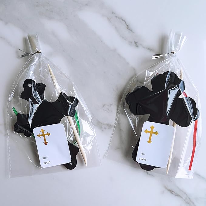 - Ideal Dimensions for Craft and Display: The scratch art cross is about 5" long, with a 4mm hole for hanging. The stylus sticks and satin ribbons are around 5.7" long, while the cellophane bags are 7.8" long and 4.7" wide. Twist ties are about 3.14" long, and the gift stickers measure around 2". This makes them easy to handle by kids and ideal for hanging on windows, doors, trees, walls, or even as gift tags, party favors and bookmarks. The entire set is compact, versatile, and easy to store.