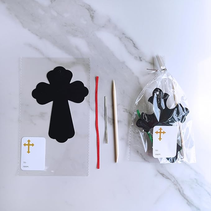 - Ideal Dimensions for Craft and Display: The scratch art cross is about 5" long, with a 4mm hole for hanging. The stylus sticks and satin ribbons are around 5.7" long, while the cellophane bags are 7.8" long and 4.7" wide. Twist ties are about 3.14" long, and the gift stickers measure around 2". This makes them easy to handle by kids and ideal for hanging on windows, doors, trees, walls, or even as gift tags, party favors and bookmarks. The entire set is compact, versatile, and easy to store.