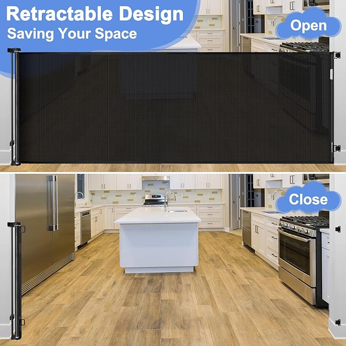 - Retractable Design: dog gates for the house extra wide is retractable and the mesh can be completely rolled up when you're not using them, taking up no space.