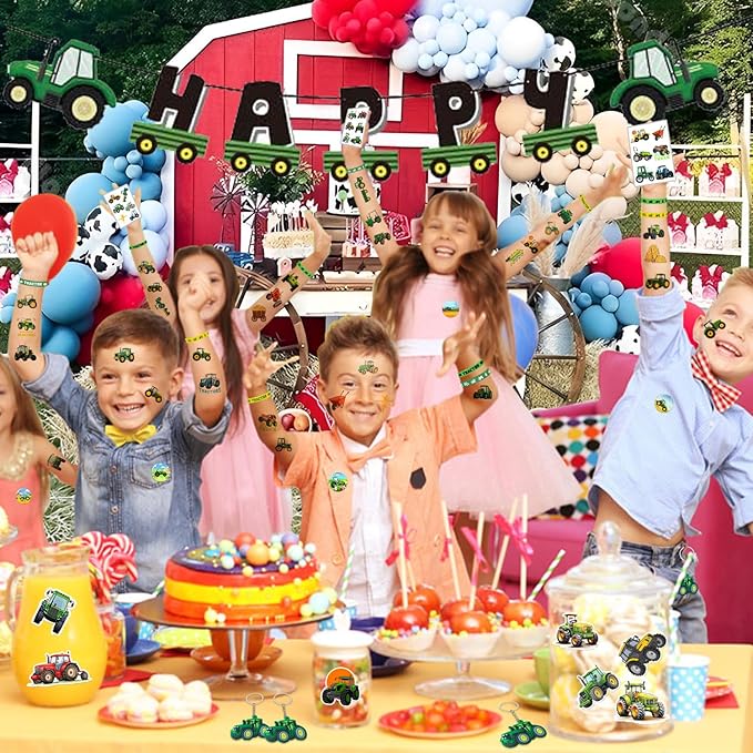 - Tractor Themed Party Supplies: You will receive 98 pieces of tractor birthday party supplies, including 12 tractor silicone wristbands, 12 tractor key chains, 12 tractor trucks button pins, 12 tractor temporary tattoos, 50 tractor farm animal stickers, perfect for tractor birthday party