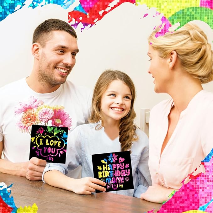 - 🎀🎉Safe & No Mess: 🌸This scratch art paper is made of premium thick paper, non-toxic and odorless, difficult to tear, and equipped with safe wooden styluses (smooth and blunt tip). So kids can safely use this party craft supplies for drawing, doodle, note, bookmark and card making, supporting children's artistic thinking and cool design ideas, perfect for use at home, on holiday or at school.