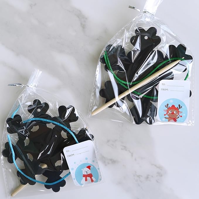 - Christmas Scratch Art Set: This magic color scratch snowflake craft kit can be easily divided into 56 individually wrapped packages. The kit includes 56 snowflake scratch paper ornaments in 8 designs, 56 scratch tools, 56 satin cords, 56 cellophane bags, 56 twist ties, 56 gift stickers, 1 roll jute rope. Once divided, each individual set includes 1 snowflake scratch paper, 1 scratch tool, 1 satin cord, 1 bag, 1 twist tie, 1 gift sticker, ensuring a complete experience for each participant.