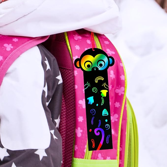 - Quality Materials: These scratch art jungle animal bookmarks are made from sturdy 110lbs (300 GSM) cardstock, the scratch paper jungle animal bookmark ornaments feature scratch-off coatings revealing rainbow colors. Bamboo-made stylus wood sticks, polyester satin cords, plastic cellophane bags, and metallic twist ties ensure quality and durability. This fun, non-toxic, and creative activity for children involves creating rainbow bookmark by simply scratching off the black coating.