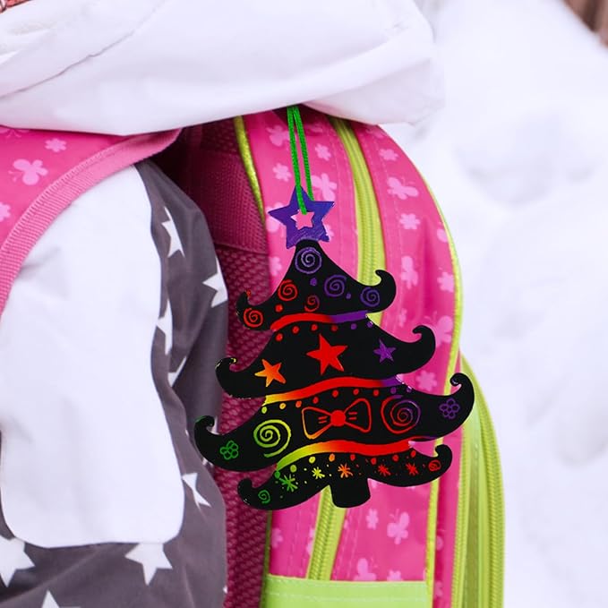 • Mesmerizing Rainbow Color Scratch Art: These scratch-off rainbow christmas tree are black, but once you start scratching, you reveal vibrant and stunning rainbow colors underneath. Our set includes 9 different christmas tree shapes, each with a star at the top. The satin ribbons come in christmas colors, offering a perfect match for your ornaments. Imaginative kids and adults will have fun etching their unique patterns and designs onto the Christmas tree cutouts ornaments.
