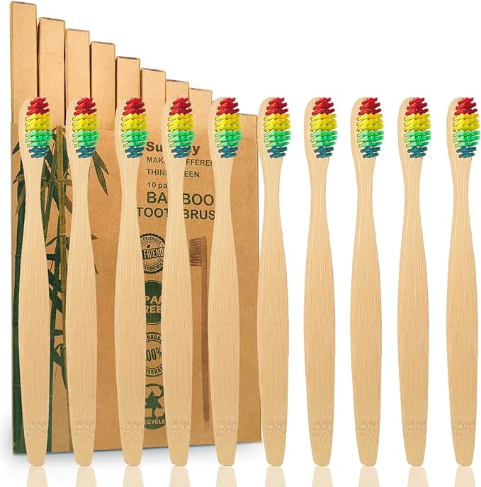 10 Pack Rainbow Bamboo Toothbrushes | Biodegradable & Compostable Eco-Friendly Natural Bamboo Charcoal Toothbrushes | BPA Free Soft Bristles Wooden Toothbrush - 100% RECYCLED PACKAGING (Rainbow)