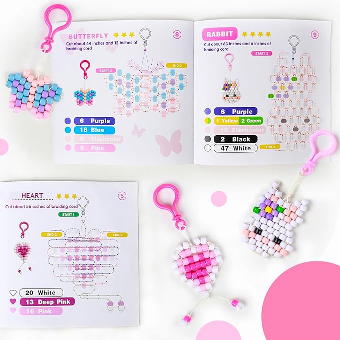 - BEAD PETS KIT: This craft for kids contains 800+ colorful pony beads, 65.6 feet of braided cord, 10 keychains, 3 plastic beading needles, 1 storage box, and 1 detailed instruction manual that teaches you how to make 10 different cute animal patterns, such as dragonfly, dolphin, crocodile, bee, heart-shaped, chick, fox, butterfly, rabbit, and penguin. They can be used to make backpack charms, bracelets, bead animals keychain, and other decorative accessories.