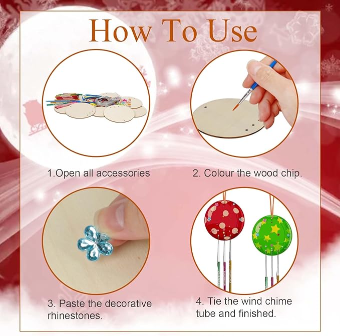 - Christmas Wind Chime Kit:The DIY wooden wind chimes kit for kids include 9x unfinished wooden round ,27x wind chime tubes((3 color,each of 9),2x paiting brushes(there no paint included),9x 1M silver wire,9 x color rope,1x rhinestone stickers.Sufficient quantity and various styles to meet your decorative needs,kids can make their own wind chime kit to celebrate Christmas Party .