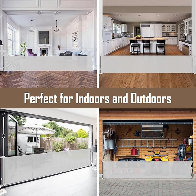 - Versatile Extra Wide Baby Gate: This retractable baby gates can be used as a baby fence, pet barrier, semi-enclosed baby play yards, fireplace gate and room divider, providing more options for homes with open floor plans or wide spaces, and also for your divide some space flexibly for babies and dogs.