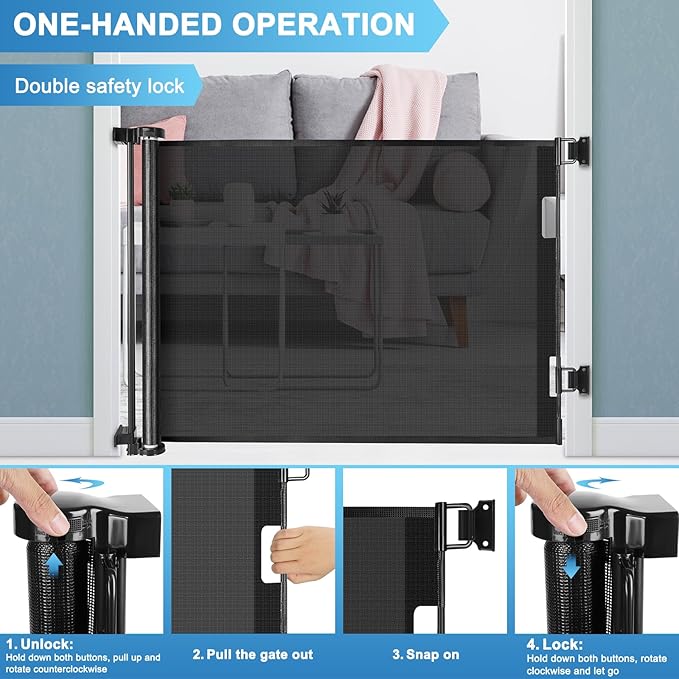 - Secure Locking: The safety lock on this retractable dog gate is easy for adults to open/close with just 1 hand, while toddlers and pets won't be able to figure out and unlock the retractable pet gate.