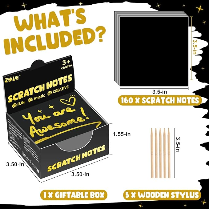 - Gold Scratch Mini Art Notes: Our scratch paper art with 160 sheets of scratch note cards (Size: 3.5*3.5inch /8.5*8.5cm) and 5 Styluses(3.5inch/8.5cm). Super Bulk arts crafts kits for fun way to doodle, leave notes, write Lists and create cool illustrations and designs. Both kids and adults love exercising their imaginations with this creative scratch art craft gift ideas