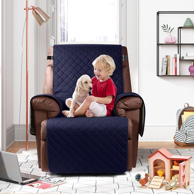 KinCam 100% Waterproof Recliner Chair Cover, Reclining Couch Covers for Pets, Dogs, Recliner Couch Slipcover Furniture Protector with Elastic Straps for Kids(28", Dark Blue)