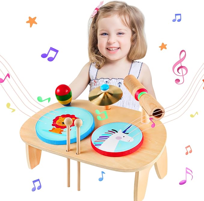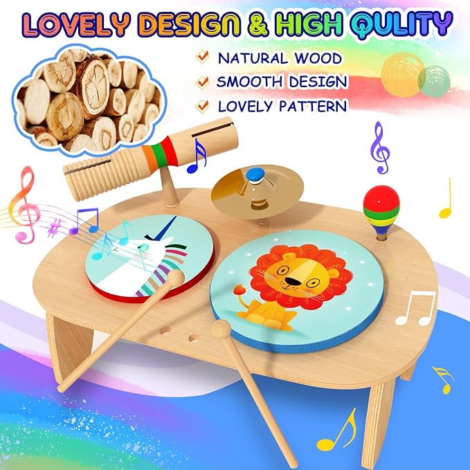 - 🎵【ALL IN ONE TODDLER DRUM SET】:This wooden musical table has six percussion instruments including a cymbal, a wood tone block ,a maracas,a 6 inch drum, a 5 inch drum and two wooden drumsticks.