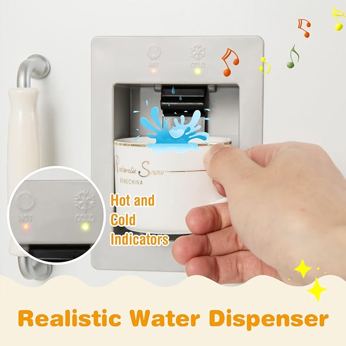- 【Separated Storage Refrigerator】Separated refrigerator provides kids with ample storage space for their toy food. Besides, this pretend play kitchen toy also features a water dispenser with red and green indicator lights. Toddlers can press it and pretend to get water to acquire more fun.