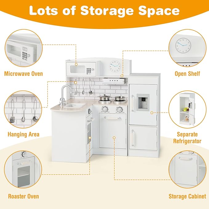 - 【Stable & Kid-Friendly Design】Made of high-quality MDF material, this corner kitchen playset for kids is durable and sturdy, which has passed ASTM and CPSIA certifications for higher security. In addition, burr-free surface and round corners prevent unexpected scratching.