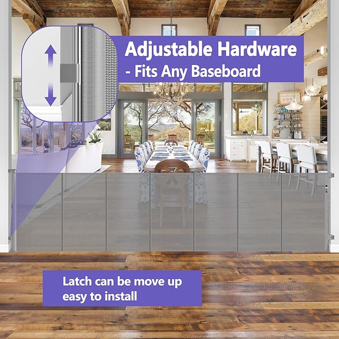 - Adjustable Hardware for Any Baseboard: No matter the height or style of your home's baseboards, our mesh baby gate comes with adjustable hardware, ensuring a seamless fit without the need for additional shims.