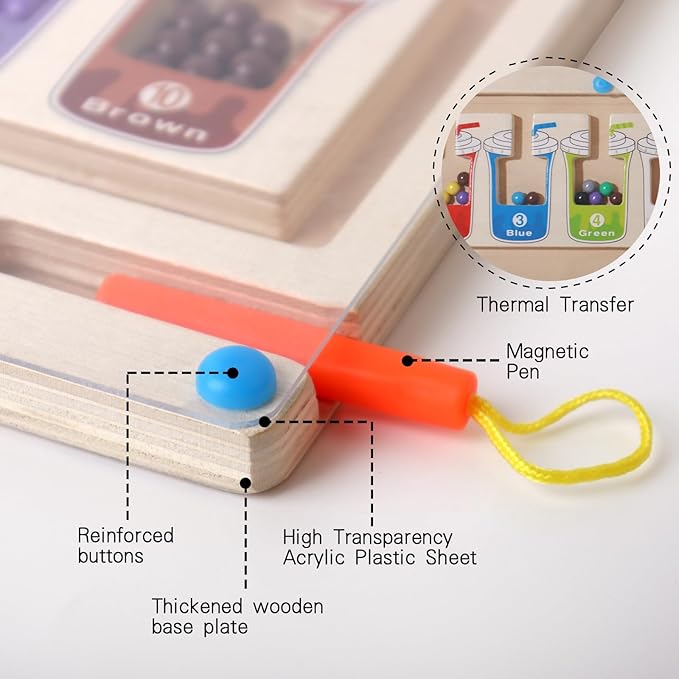- Montessori Toys for Kids 3+:The magnetic color and number maze surface has a sturdy acrylic lid that encloses everything in the board.10 different colored cups correspond to the numbers 1-10, and kids can put all the magnetic beads back in place with a magnetic pen. This is a fun challenge!