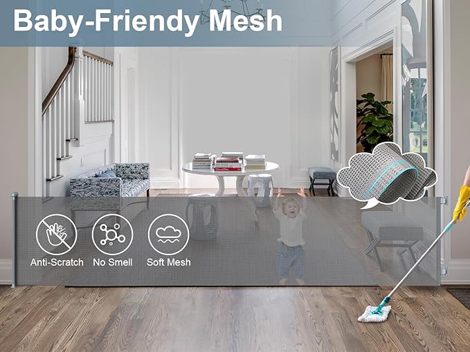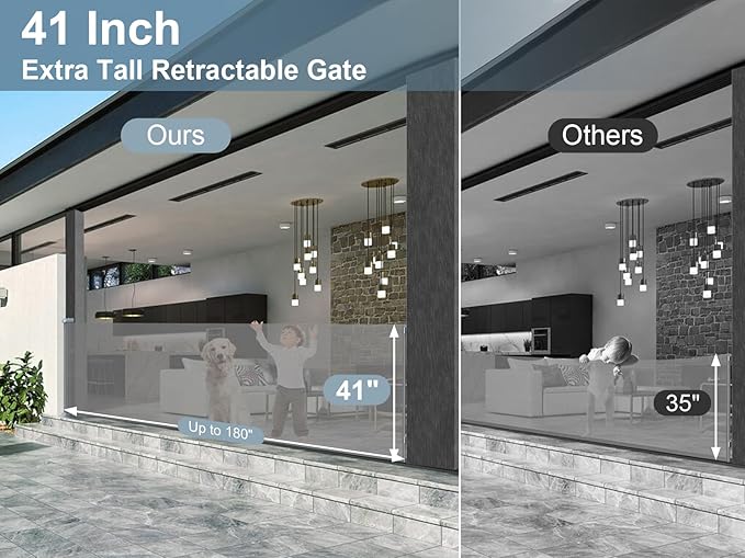 - Extra Wide Retractable Gate: Our baby gate expands up to 180" wide and stands 41" tall, designed to fit a wide range of openings. It provides an effective barrier for both children and pets, the mesh dog gate rolls up neatly to save space when not in use.