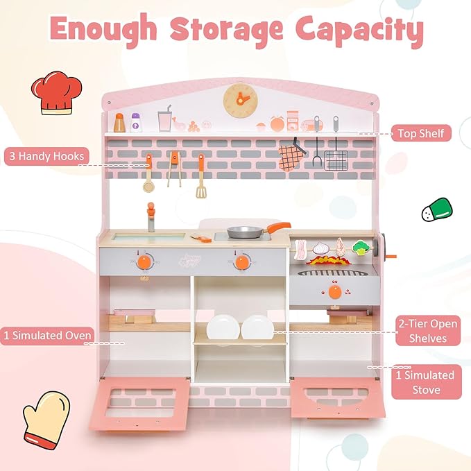 - 【Abundant Storage Areas】: The top shelf offers enough storage space for your condiments. And there are 3 hooks for kitchen utensils, 2 open shelves for small dishes or condiments and 1 simulated oven for baking game. Magnetic catch ensures effortless opening. This wooden toddler kitchen playset helps kids learn how to sort out their items.