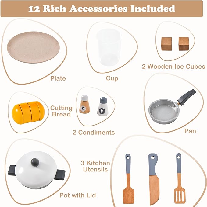 • 【Rich Accessories Included】 This kids kitchen playset is equipped with 1 pan, 1 pot with lid, 1 knife, 1 flat spatula, 1 slotted spatula, 1 cup, 1 plate, 2 ice cubes and 2 condiments, allowing kids to learn how to use different kitchen accessories. Additionally, this wooden kitchen for kids with a cutting bread for kids to slice the pieces apart to add more fun.