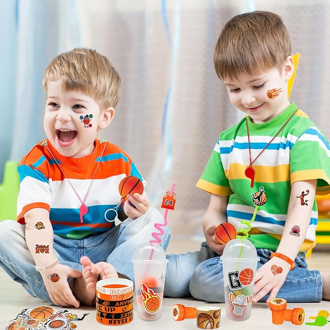146 Pcs basketball Party Favors, Sports Party Supplies with Cup Straw Basketball Keychain Tattoo Sticker Slap Bracelet Whistle Treat Bag Fillers for Classroom Rewards Birthday Party (Basketball)