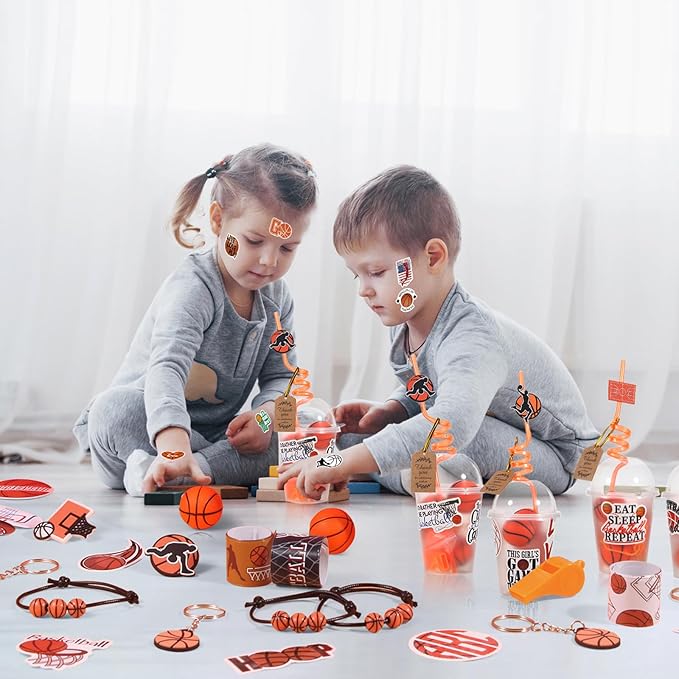 LiYiQ 158 Pcs Basketball Party Favors Basketball Party Supplies with Cup Straw Stress Ball Keychain Sticker Slaps Bracelets Whistle Thank You Tags for Basketball Birthday Decorations (Basketball)