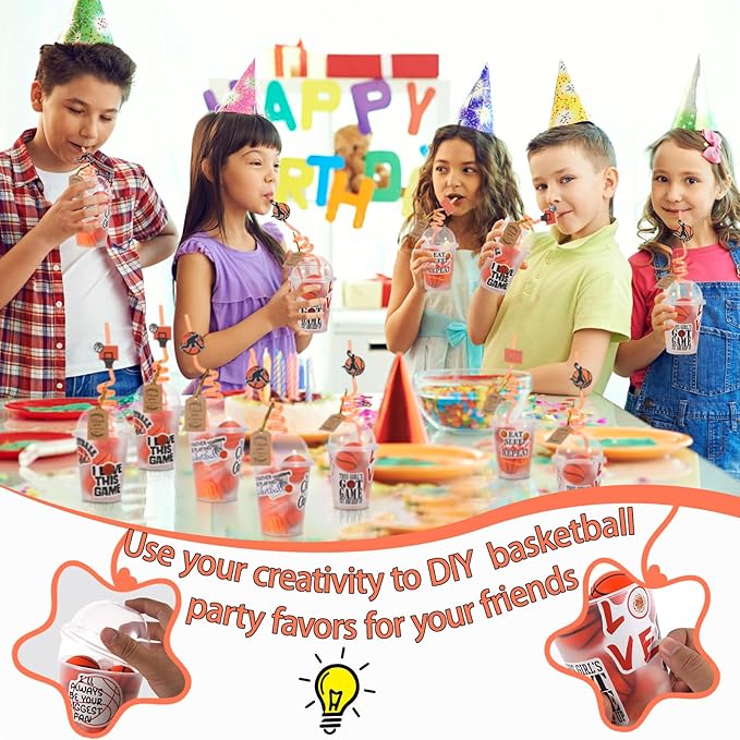- Quality and Reliable Material: basketball bracelets are made of quality materials, basketball straws and whistles are made of ABS plastic, mini basketball are made of PU materials, basketball themed stickers are made of PVC; The cup is made of quality PP material, and the thank you tag is made of Kraft paper, which is reliable and safe to use, not easy to fade or break, reusable and sturdy.