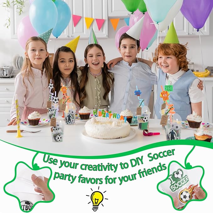 - Quality and Reliable Material: soccer bracelets are made of quality materials, soccer straws and whistles are made of ABS plastic, mini soccer are made of PU materials, soccer themed stickers are made of PVC; The cup is made of quality PP material, and the thank you tag is made of Kraft paper, which is reliable and safe to use, not easy to fade or break, reusable and sturdy.