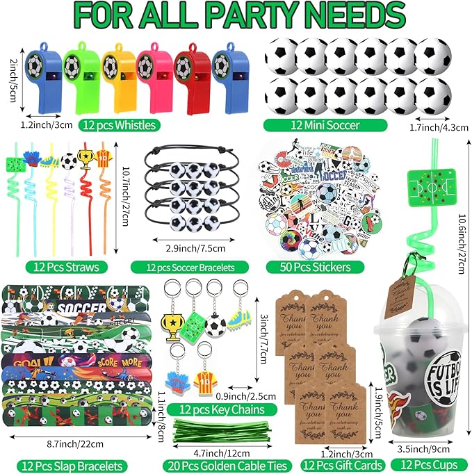 - Large Quantity Soccer Party Favors: you will receive 12 pcs cups with dome lids, 12 pcs soccer straws, 12 pcs soccer whistles, 12 pcs soccer key chains, 12 pcs mini soccer, 12 pcs soccer bracelets,12 pcs slap bracelets, 12 pcs thank you tags, 12 pcs twist ties,50 pcs soccer themed stickers, sufficient quantity to meet your daily or party needs.