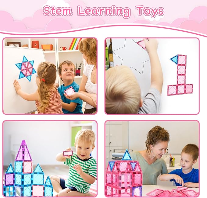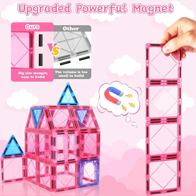 - STRONG MAGNETS MORE STABLE:Our kids magnetic tiles building blocks with larger and stronger magnets inside ensure a secure connection,allowing the magnetiles construction of more intricate shapes without collapsing,bringing your kids age 3-4 3-5 5-6 a better play experience.Let children create all sorts of imaginative masterpieces.