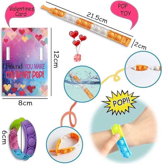 - Premium Material: Our pop fidget bracelets are made of high-quality silicone, soft and durable. Our Valentines cards are made of thick cards, sturdy and practical. Valentine greeting cards are designed with cut slits to allow the pop fidget bracelets toy to slide through, let others know where this gift comes from!