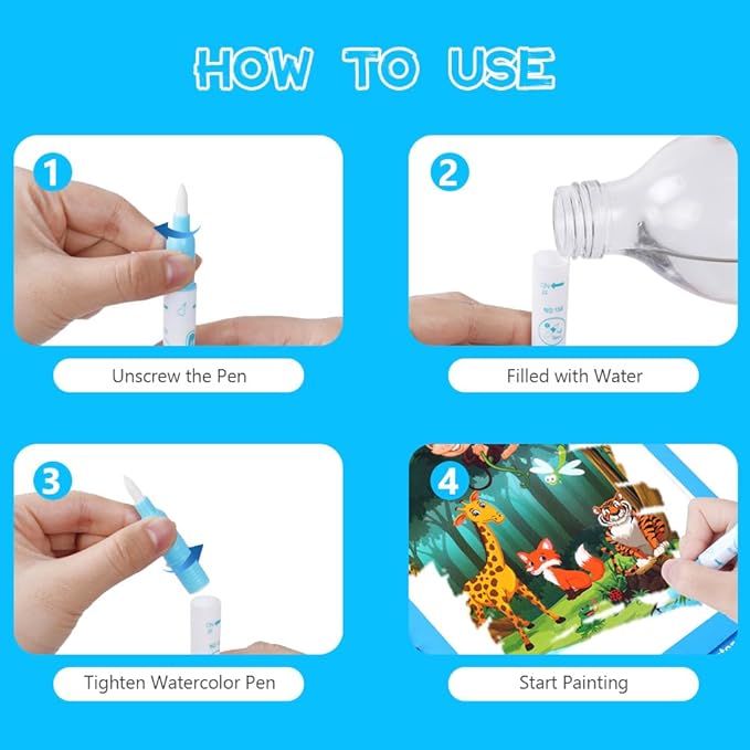 - Easy to Use: You just use the magic pen with water, add some water, and smear on every corner of the water book to see the hidden colors, patterns, and text; they will disappear naturally after drying for 8 minutes, so you can use it again and again Write and paint again with these watercolor paints!