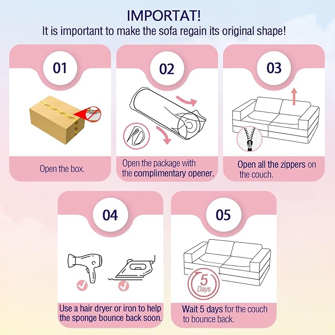 - [Let It Inflate 3-5 Days] Upon opening, the kids’ foam couch may appear thin due to compression. Open all zippers and wait 3-5 days for it to regain original shape. For quicker results, use a garment steamer to restore foam height and remove wrinkles