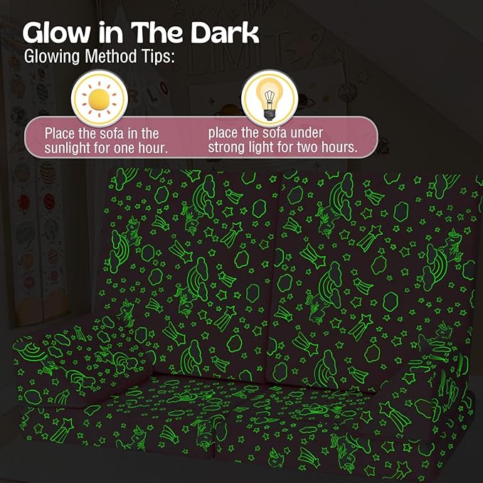 - [Unique Luminous Design] Place the kids couch under bright light for 10–15 minutes, then watch it glow in the dark—the brighter the light, the stronger the glow. Adds a magical touch to playtime and sparks imagination