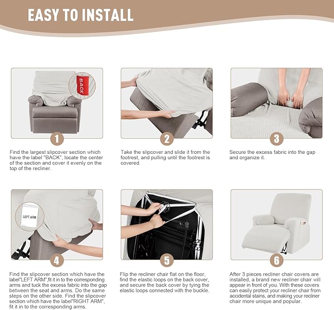 - EASY TO INSTALL: Our recliner sofa slipcovers have exquisite workmanship, including 2 pieces arm covers, 1 piece seat cover, 3 pieces cover totally. The recliner covers also equips with bottom elastic and reinforcement straps, you can use buckle to make the cover in place without moving.