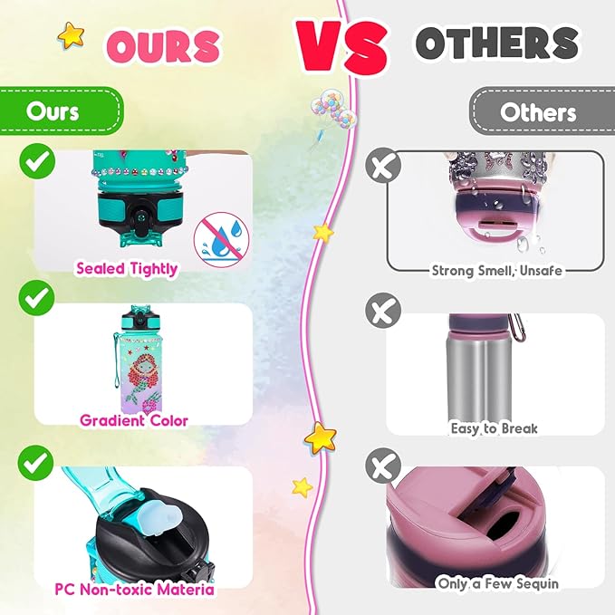 - Decorate Your Own Water Bottle Kits: Our DIY Water Bottle Kits includes a 600ml water bottle, 1 mermaid diamond painting set, 3 gemstone stickers, 1 diamond pen, 1 plastic tray, 1 jelly, 1 hanging rope and colorful diamonds. Your girls can decorate their own water bottles