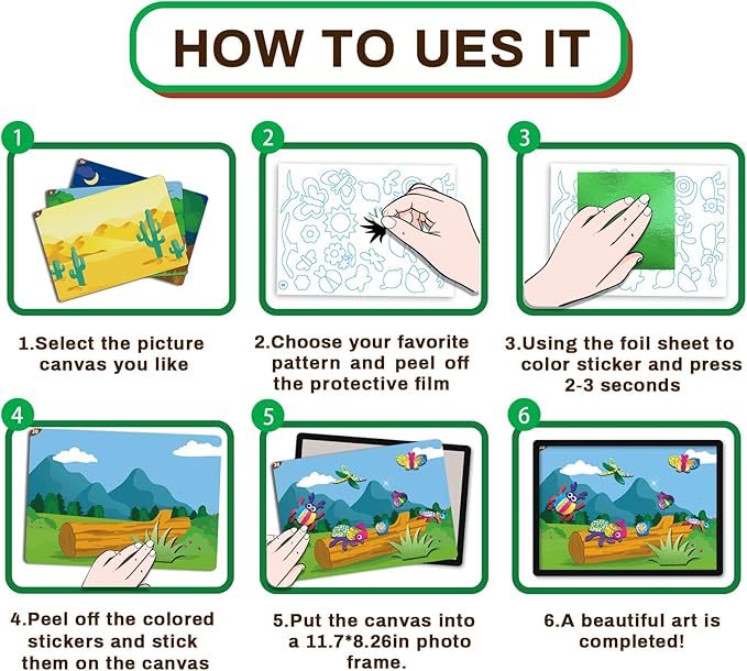 - 【Easy to use】Choose a picture, select stickers and apply color using sparkly foil sheets. Add as many as possible various amazing stickers , and make it to bring you to the foil fun picture life! Whether at home or on the go, this kit is versatile and portable, providing creative entertainment wherever your child may be.