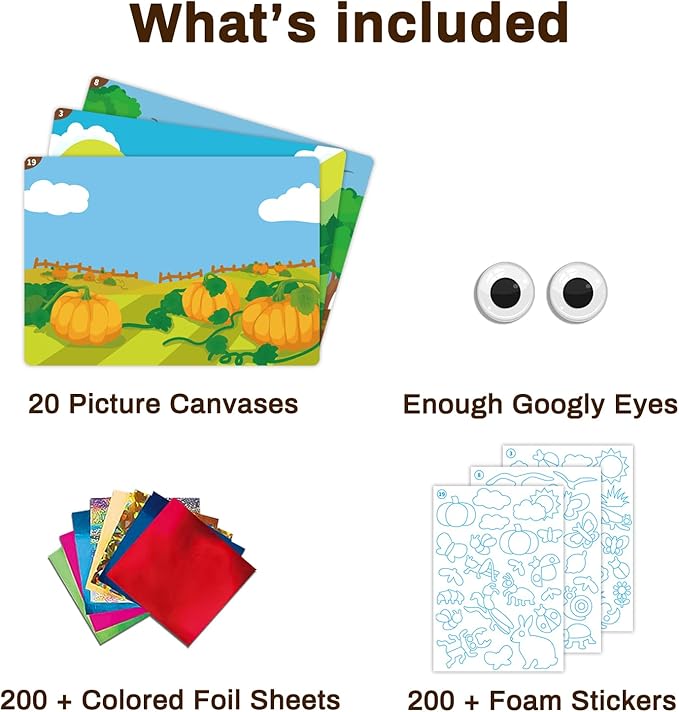 - 【Product content】200 Colored Foil Sheets, 200 Foam Sticker Sheets (200+ Foam Stickers), 20 Picture Canvases(double size printing ), and Googly Eyes, Instruction Manual.Sufficient colored stickers are enough for children to create rich and colorful styles.