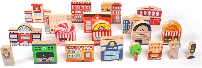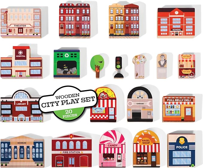 - 20 PIECE SET - INCLUDES 15 WOODEN BUILDINGS - Hospital, School, Fire Station, Theater, Museum, Library, Candy Store, Pizza Shop, Brownstone A, Brownstone B, Garage, Bagel Shop, Recycling Center, Deli, Police Station INCLUDES 5 WOODEN SIGNS AND ACCESSORIES - Statue, Tree, Hot Dog Cart, Garbage Can, Traffic Light
