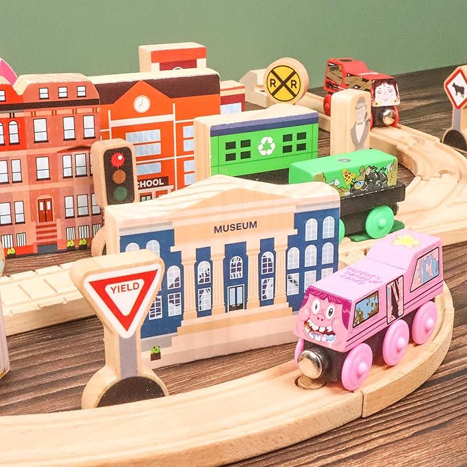 - WOODEN CITY PLAY SET HELPS WITH CREATIVITY TO MAKE THE MOST EXCITING AND FUN WOODEN RAILWAY! Town buildings add creative destinations to your train layout, great for Community Helpers