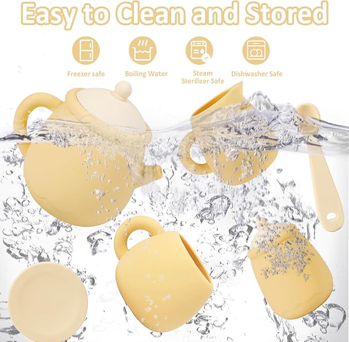 - 【Easy to Clean】The smooth silicone surface is easy to clean, just rinse with water and it will be as clean as new, no need to worry about tea stains or stains left behind. Also dishwasher safe. The teapot and cups are made with small hands in mind, making it easy for your little ones to pour and sip just like the grown-ups