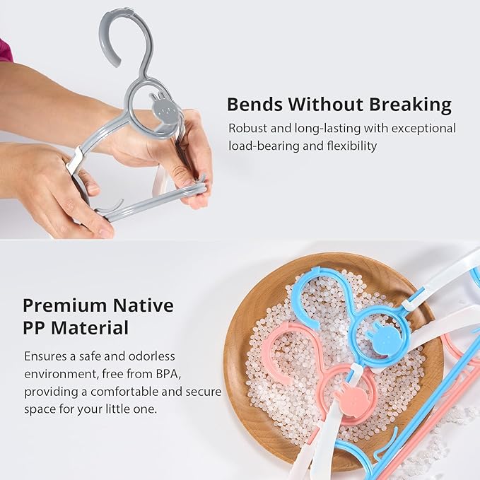 - Safe Material:Crafted from safe and durable PP material, our kids clothes hangers feature a smooth surface that reduces the risk of scratches. Our baby hanger are designed to withstand strong bending without breaking, ensuring safety during kids' use