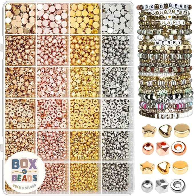 - Box O Beads spacer beads kit comes with 3000 assorted spacer beads, including 720 round beads, 600 faceted beads, 480p flat circle beads, 400 star beads, 400 heart beads, 400 flat disc beads. More than enough spacer beads for your jewelry and bracelet making needs. Add a sparkle to your bracelets, earrings and necklaces. The perfect addition to our earth tones clay bead sets. Recommended for teens and adults 13 years old and up.